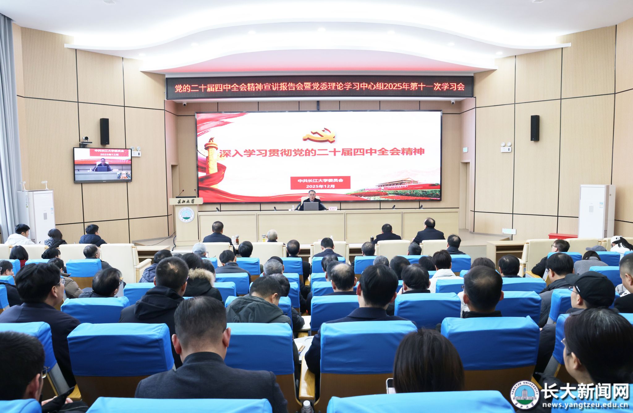 新闻网讯(记者 归航/文 刘健/摄)12月25日下午,学校举行党的二十届四中全会精神宣讲报告会暨校党委理论学习中心组2025年第11次(扩大)学习会。党委书记王建平以“深学笃行党的二十届四中全会精神 奋力谱写特色高水平大学建设新篇章”为题,从“凝心铸魂、举旗定向”“牢记嘱托、勇担使命”“实干笃行、乘势而上”三个维度,对党的二十届四中全会精神、湖北省委十二届十一次全会部署及学校“十五五”规划编制与实施作了系统阐释与深入解读。